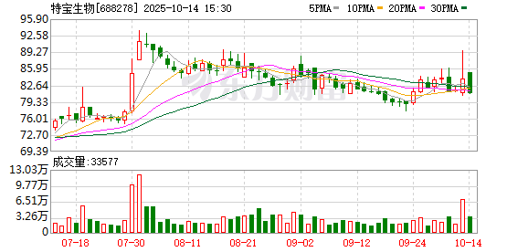 特宝生物10月14日大宗交易平台出现一笔成交,成交量4.65万股,成交金额376.04万元,大宗交易成交价为80.92元。该笔交易的买方营业部为国泰海通证券股份有限公司总部,卖方营业部为广发证券股份有限公司厦门湖滨南路证券营业部。